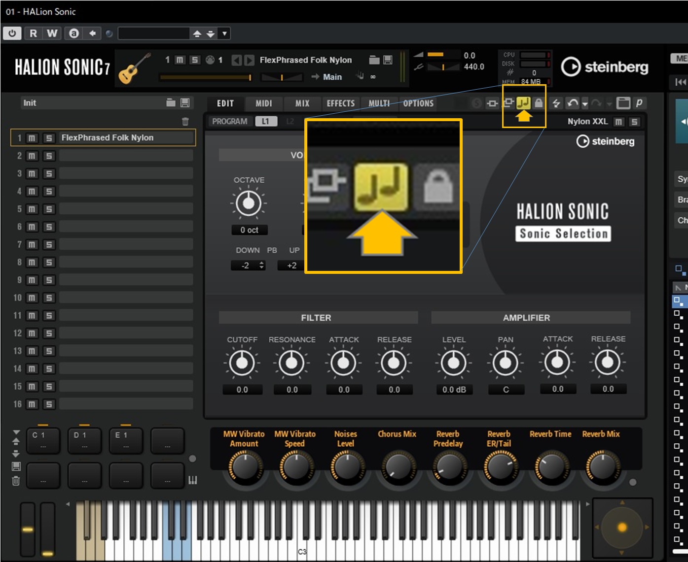 HALion Sonic 7 のプリセットの中にはアルペジエーターのようにフレーズを繰り返しループ再生するものがあります。 これらのフレーズやパターンなどのシーケンスは、打ち込みの際に邪魔になることが多いので、簡単にオフにして止めることができます。画像はオフにした状態です。