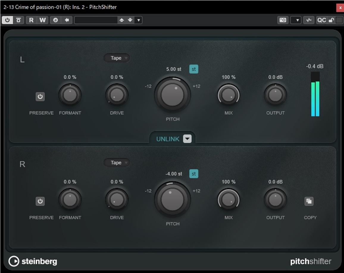 なんと、左右で別々にピッチシフトを設定するような変態チックなこともできます。