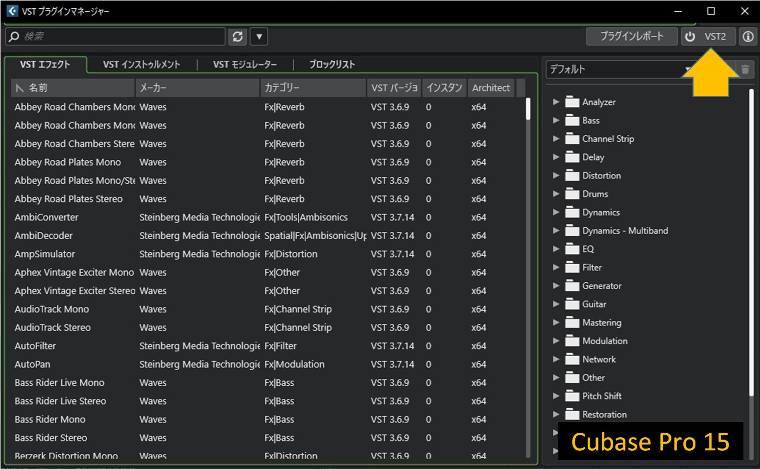 「VST2」ボタンをクリックするとスキャンが始まるようですが「Scaning」の表示が無いので、処理中なのかフリーズしてるのかが判別できません。こういうところはちょっと残念ですね。ホントはきれいさっぱり廃止してしまいたいんだろうなあ。