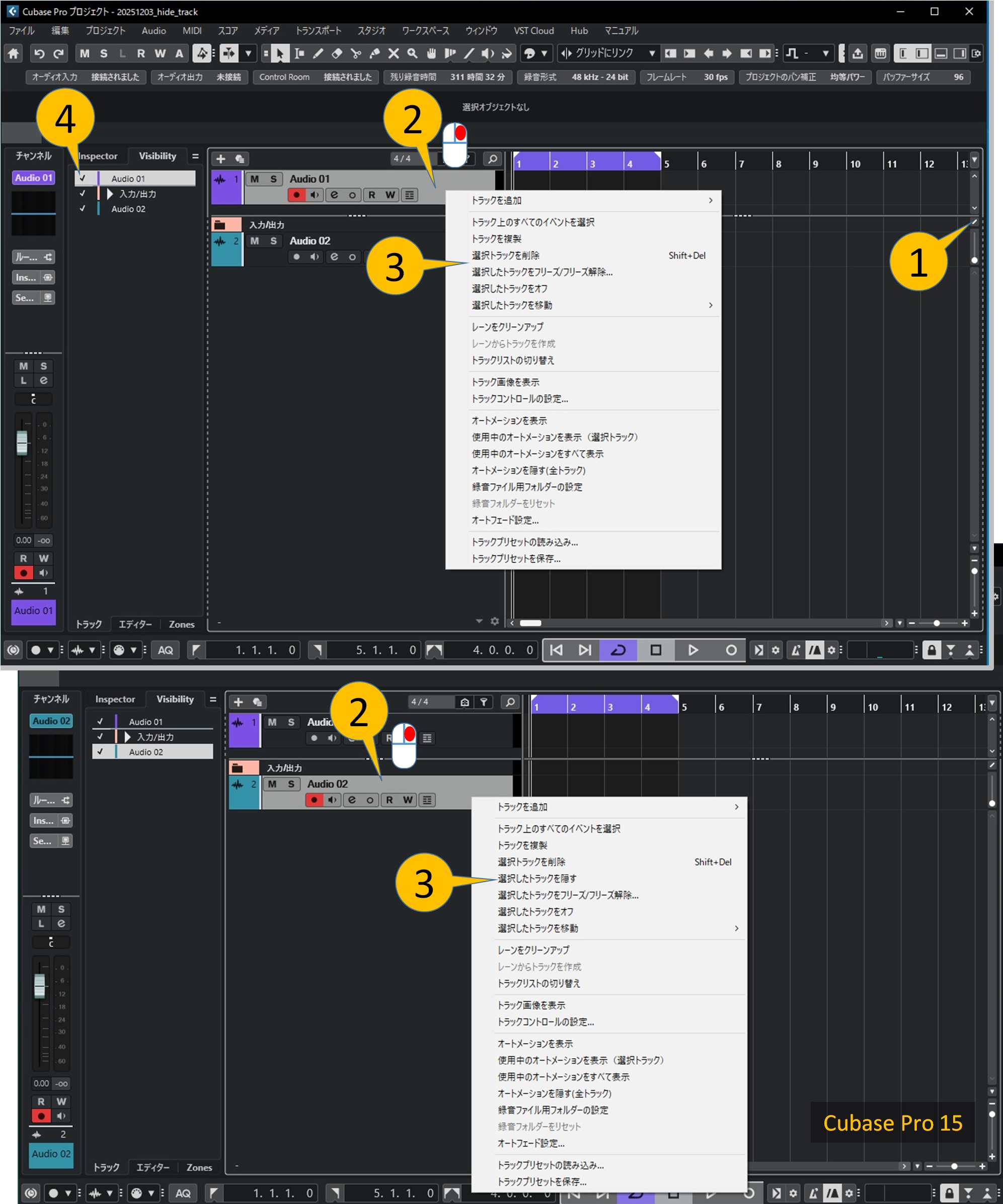 分割線の上側のトラックの場合はインスペクターの Visibility のチェックを外す④ことで隠すしかないようです。