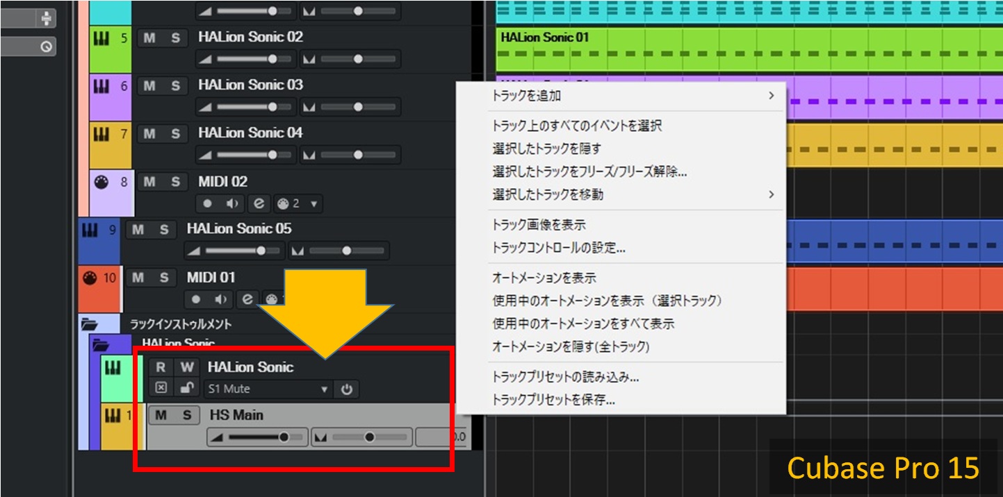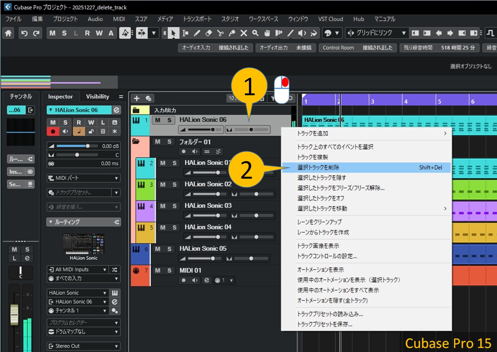 トラックの削除はトラックヘッダーのコンテキストメニューから行います。[Shift]+[Del]のショートカットでも削除できます。