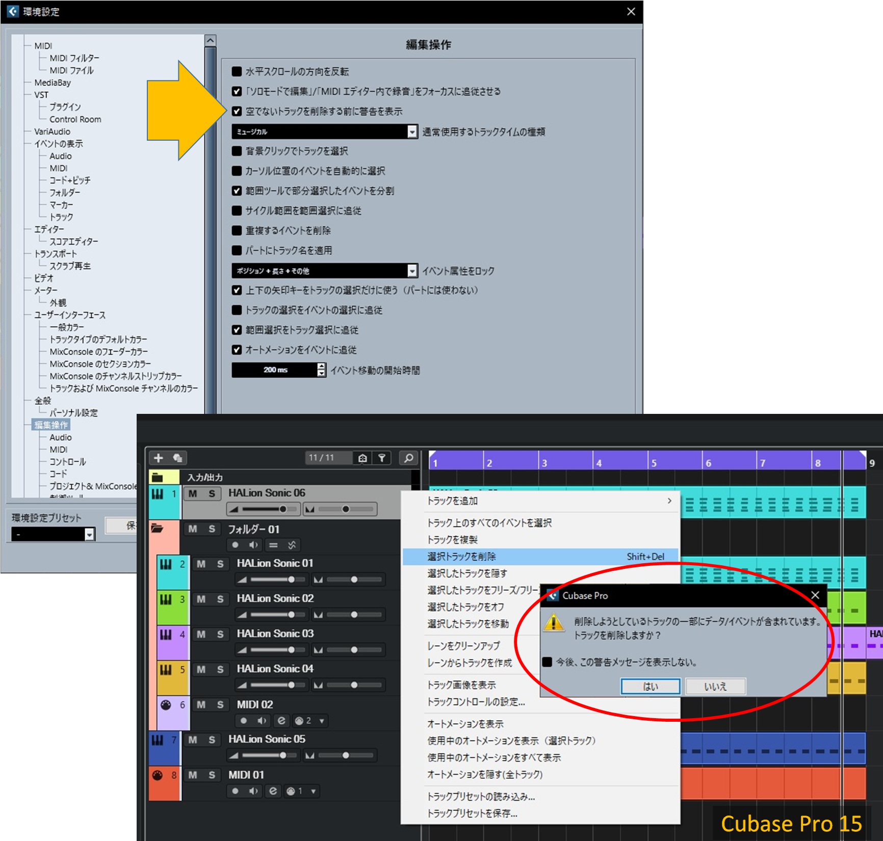 「空でないトラックを削除する前に警告を表示」にチェックを入れると、以下のような場合に警告のダイアログが出ます。