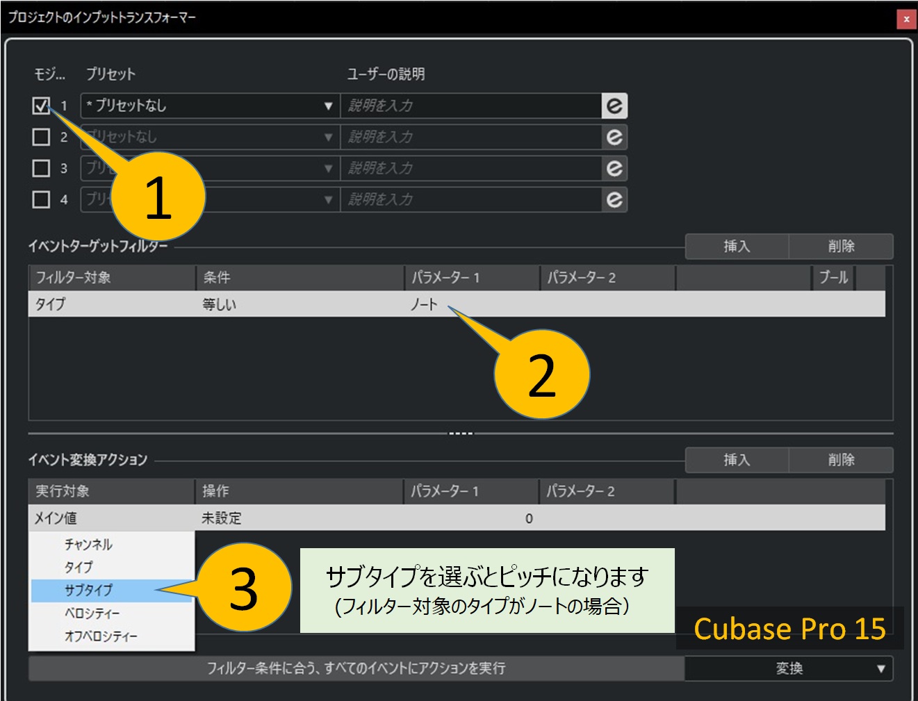 - イベント変換アクションの実行対象で「サブタイプ」【③】を選ぶと「ピッチ」が設定されます