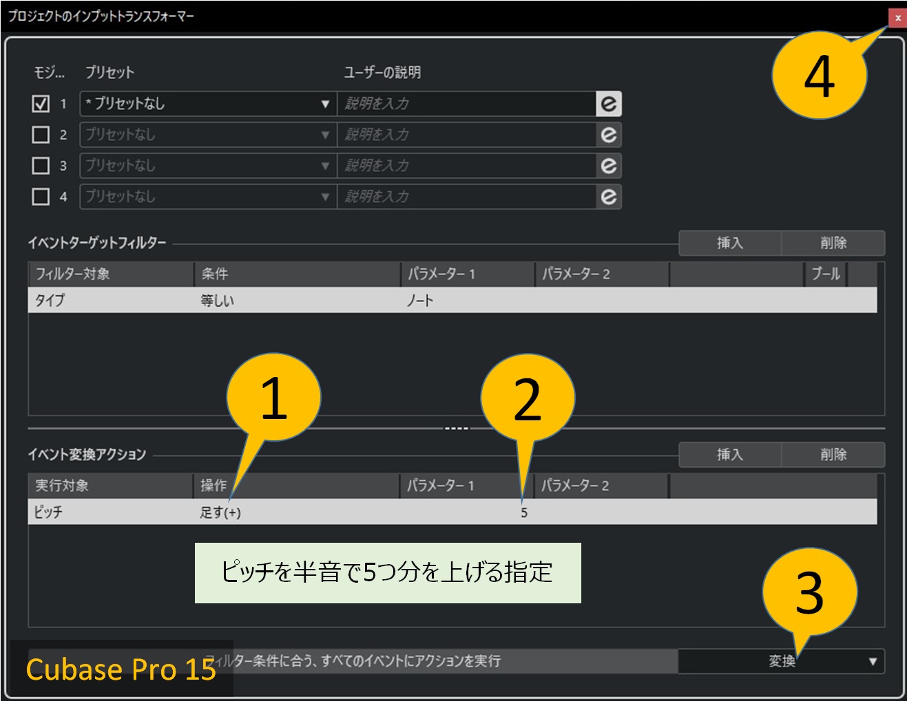 ここではピッチを一律、半音で5つ分を上げる設定を例にします。