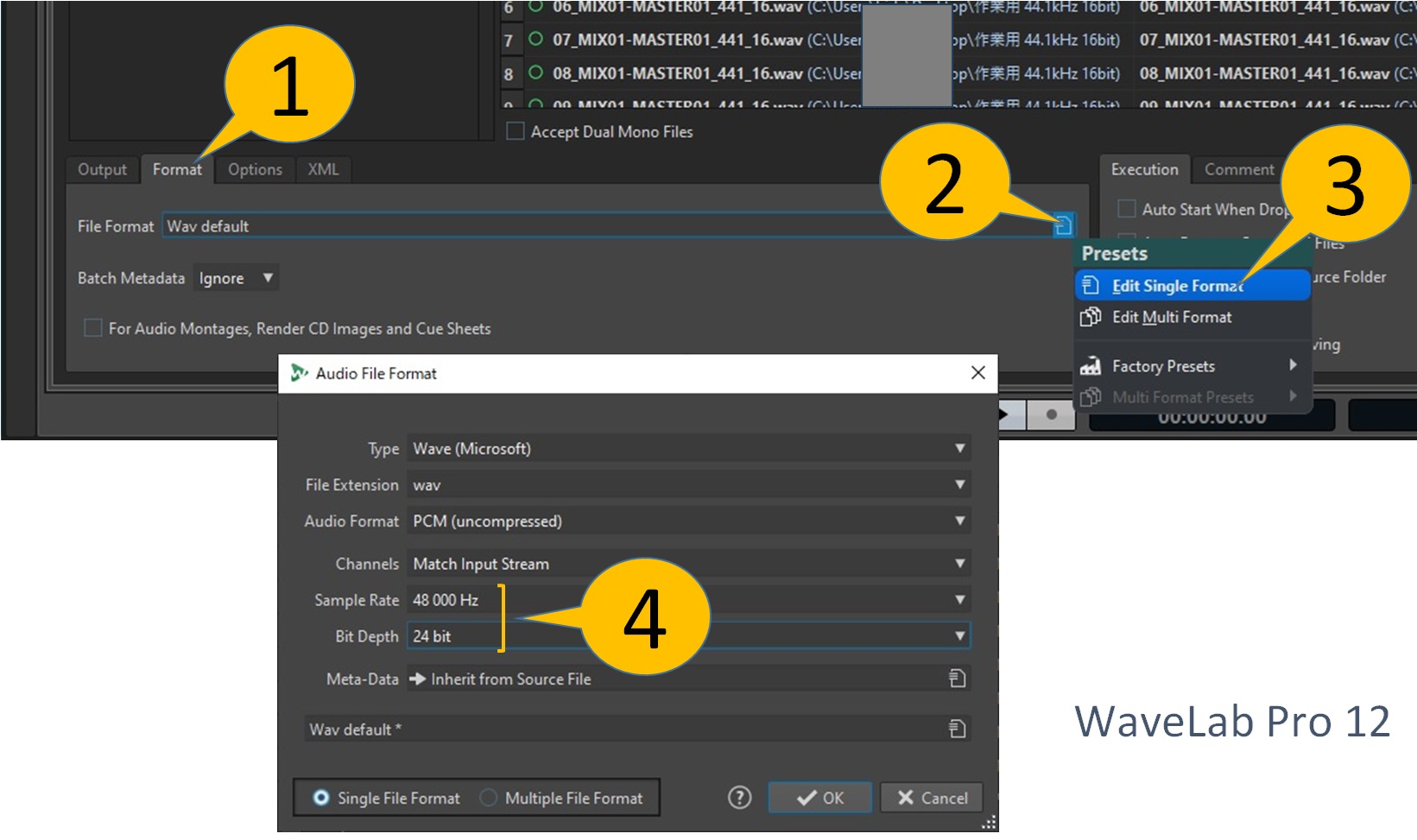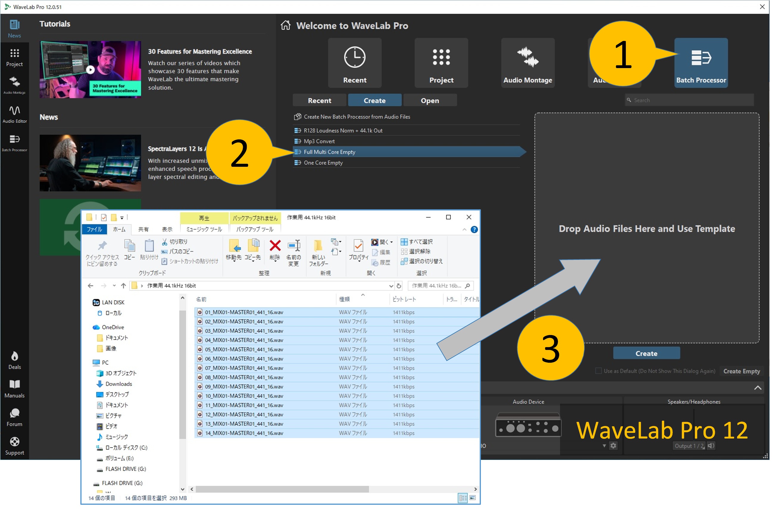 WaveLabを起動し、スタートアップアシスタントウィンドウで「一括処理セット (Batch Processor」①を選び、テンプレートの「Full Multi Core Empty」②を選択。