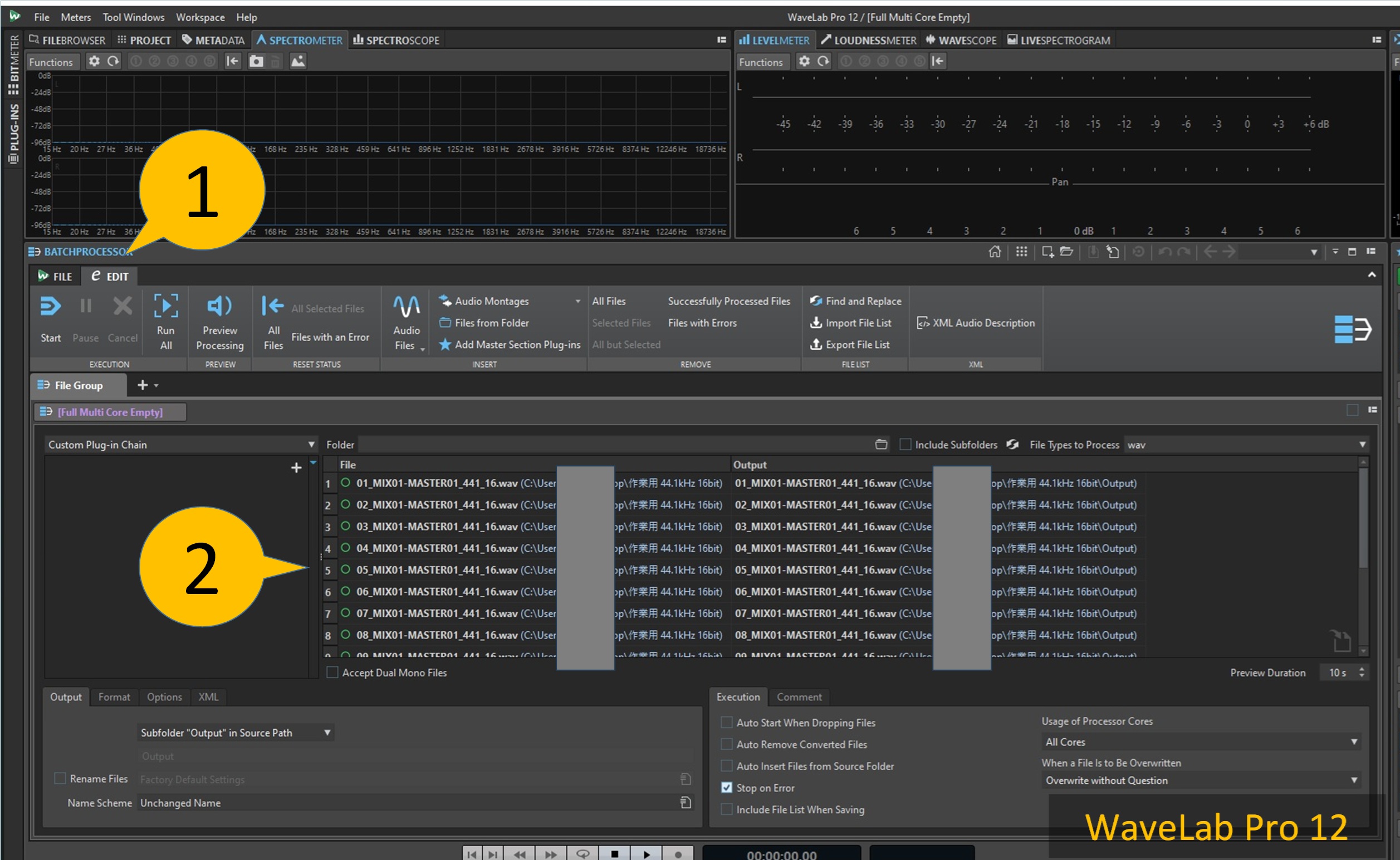 一括処理セット (Batch Processor)①が開き、対象ファイルが読み込まれます②。