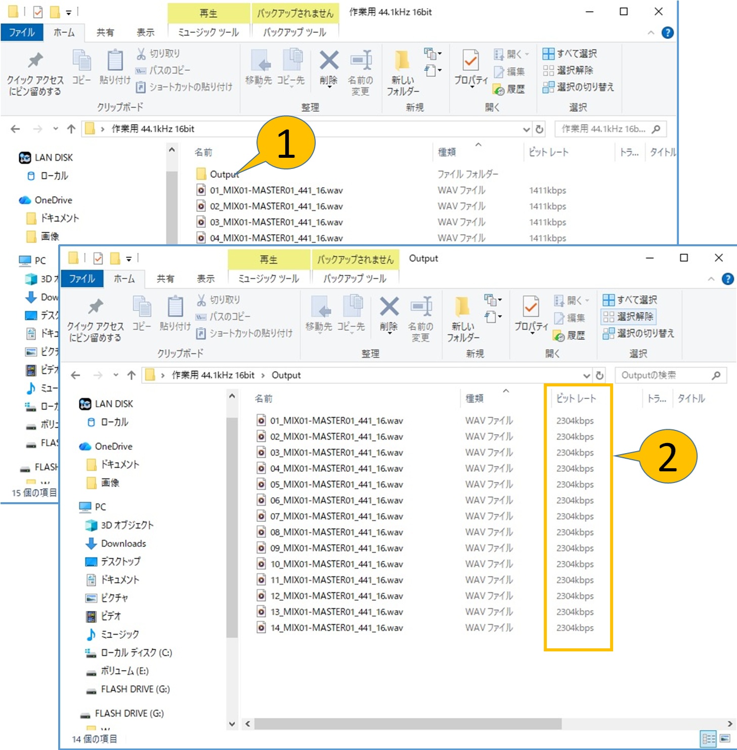 変換した後のファイルは「Output」フォルダー①に作られます。意図通りに変換されているかどうかはビットレート②からも判断できます。